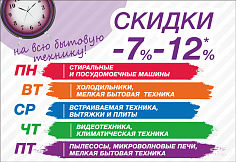 В БУДНИЕ ДНИ СКИДКИ -7% -12% С ПОНЕДЕЛЬНИКА ПО ПЯТНИЦУ НА РАЗНЫЕ КАТЕГОРИИ ТЕХНИКИ!
