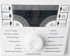 Параметры стирки, отображенные на дисплее, устанавливаются с помощью ручки выбора. Рядом с ручкой выбора расположены кнопки, которые используются для включения/выключения машины, для отмены программы стирки, для сохранения скорректированных параметров стирки в памяти машины, для изменения уже выбранных параметров.