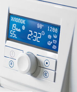 На жидкокристаллическом дисплее отображаются все данные о стирке: программа стирки, температура нагрева воды, частота вращения барабана при отжиме, используемые дополнительные функции, оставшееся до начала или окончания стирки время, выполняемая операция стирки, а также расход электроэнергии и воды при выполнении программы стирки. Информация на дисплее может отображаться на одном из четырех языков — русский, украинский, английский, немецкий.
