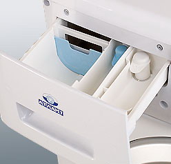 Лоток для моющих средств выдвигается и закрывается без усилий. Он имеет три отделения, отмеченные цифрами и символом: для предварительной стирки белья; для основной стирки; для средств спецобработки (кондиционирующих, крахмалящих, ароматизующих добавок). Лоток приспособлен для использования как сыпучих, так и жидких моющих средств.